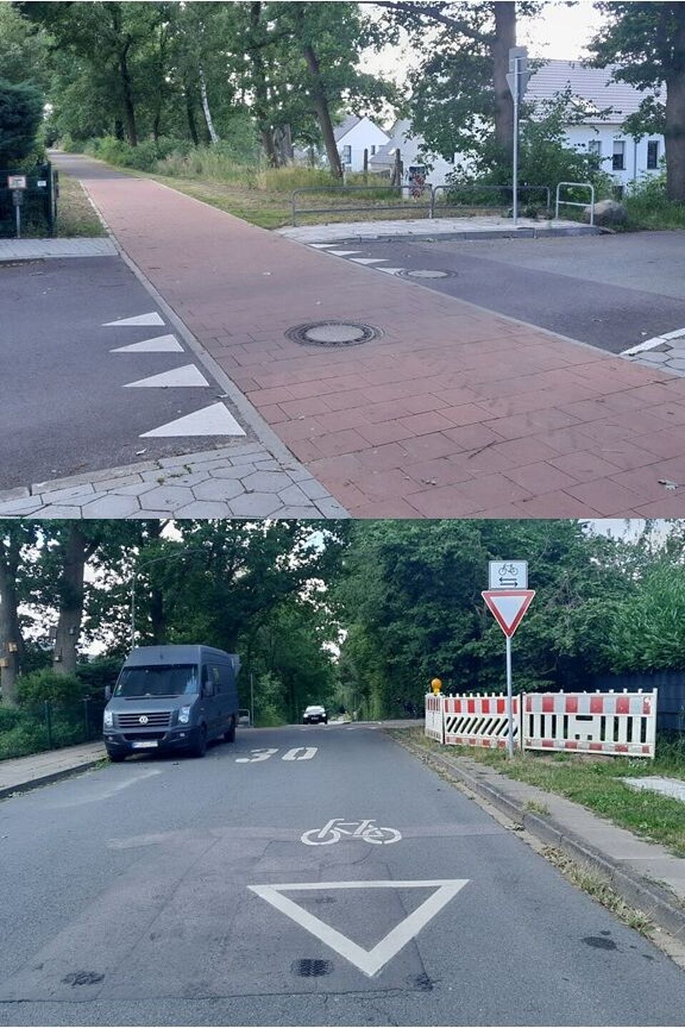 Dankenswerter Weise hat sich die Stadt daran gemacht, dieses Konzept auch umzusetzen. Ein gutes Stück des Radweges auf der ehemaligen Trasse der Kreisbahn wurde saniert, dabei müssen an der ersten Kreuzung auf Glinder Gebiet Autofahrer Vorfahrt achten, Radfahrende sind haben Vorfahrt.